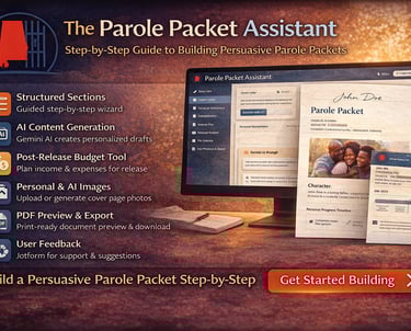 AI-Powered Parole Packet Assistant: A unique feature that helps users draft key sections of their parole packet (like personal statements and rehabilitation summaries) by analyzing their progress within the app against official guidelines.