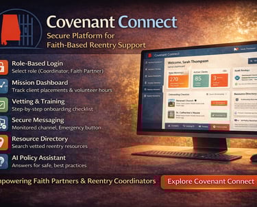 Covenant Connect is a sophisticated prototype for a mission-critical web application designed to be a secure coordination hub for organizations involved in community-based rehabilitation and reentry. Its primary users are faith partners, reentry coordinators, volunteers, and families. The platform is built on a foundation of security, accountability, and trauma-informed principles, aiming to create a safe and effective environment for supporting individuals rejoining the community, while also prioritizing victim-centered workflows.