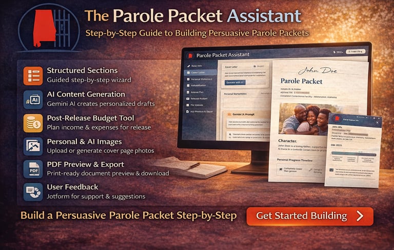 Parole Packet Builder: A comprehensive tool to prepare for parole hearings. It features a document checklist, file uploads, a Score Simulator based on the official Alabama Board of Pardons and Paroles guidelines (Form ABPP-2), and an AI-powered Letter Assistant to help draft support letters.